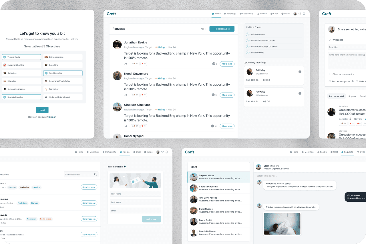 We borrowed some ideas from products like LaunchClub and LinkedIn, and closing the gaps left for our users. We also borrowed from Industry experts who shared their opinions from their experiences, during the user interviews.
