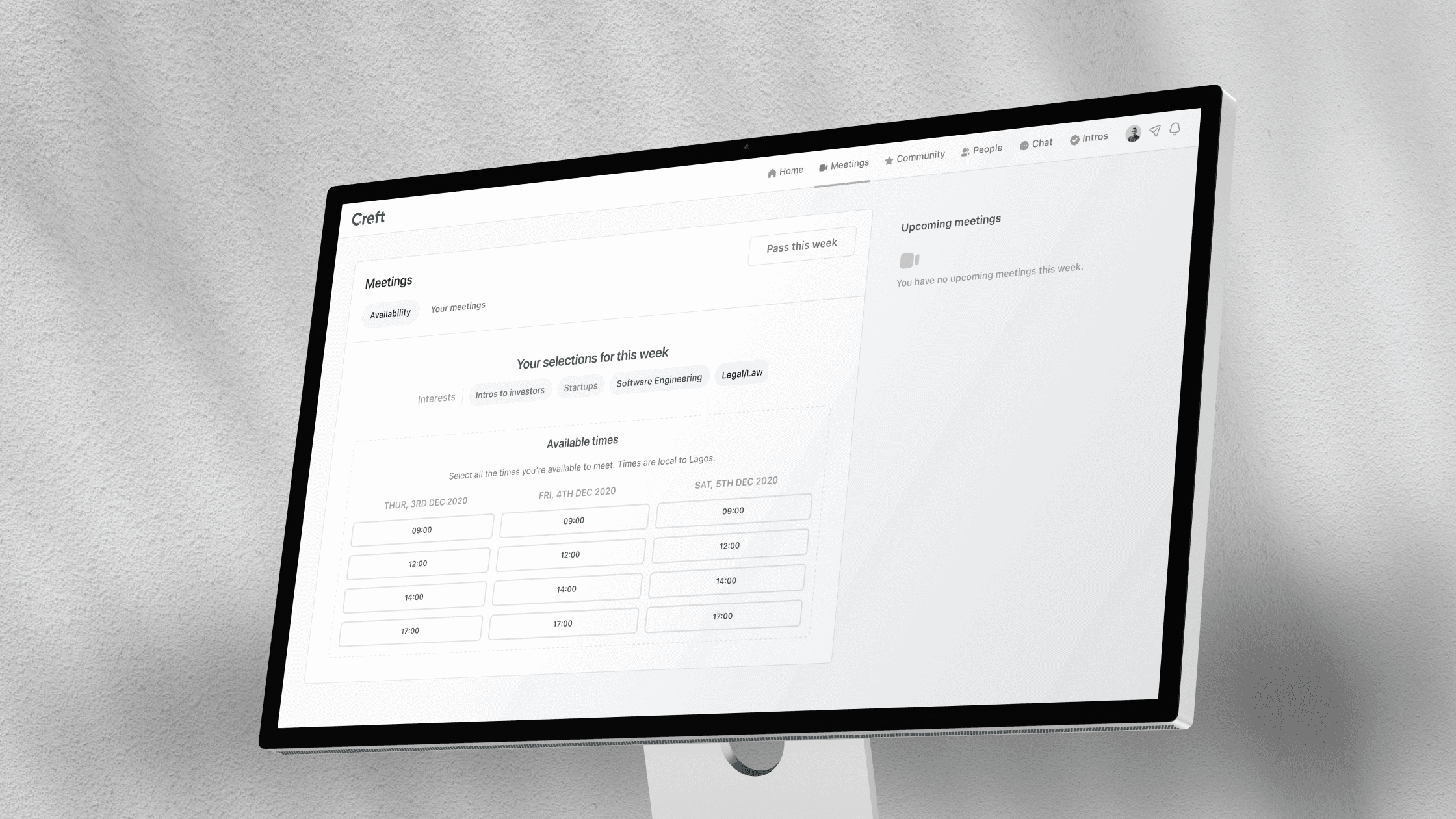 Say you wanted to learn or share something around Web3, you would select your agendas and time-blocks. You’d meet up with someone with the same agenda that week and follow up on what ever was discussed!